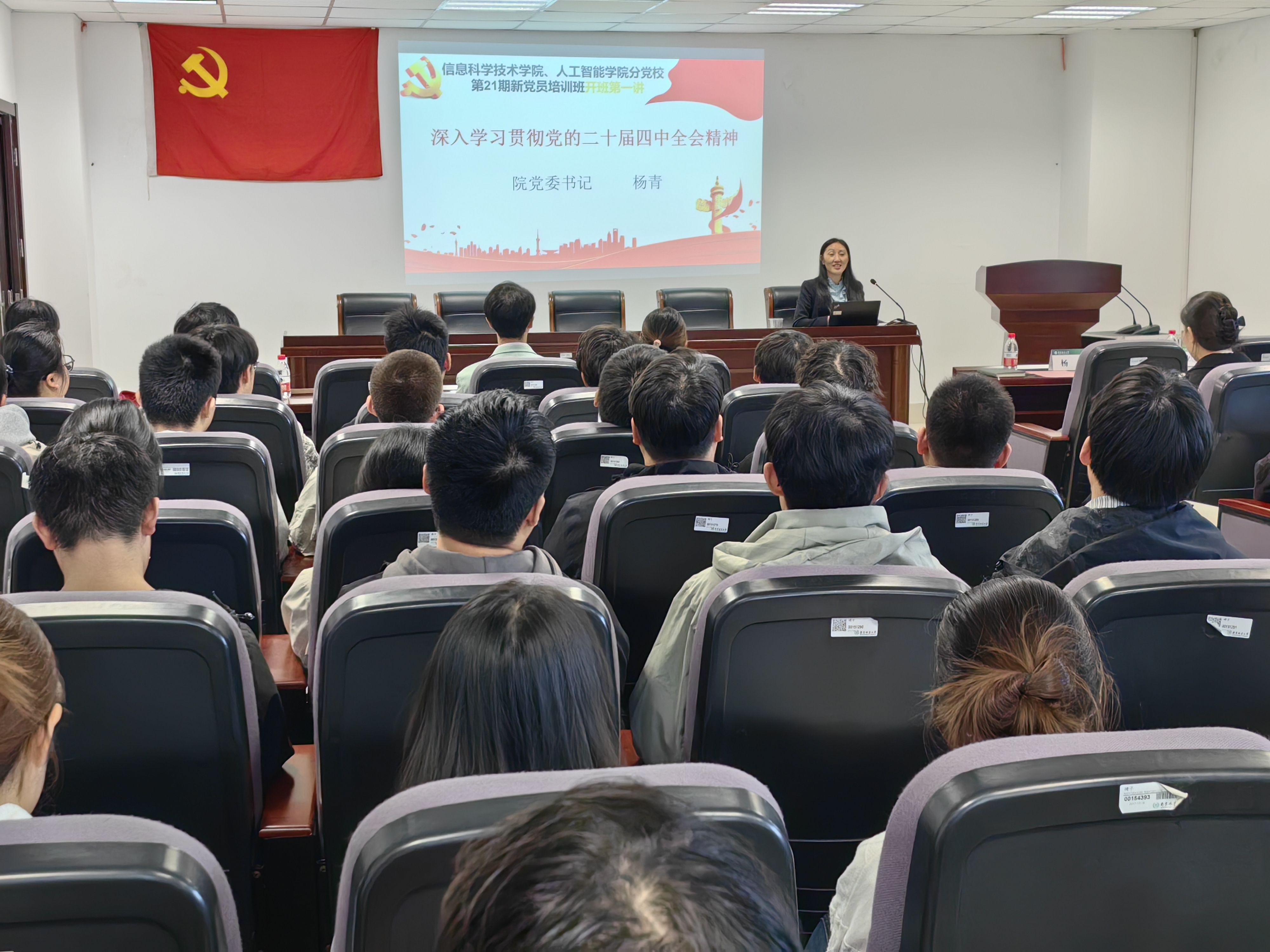 开班典礼结束后,院党委书记杨青以《深入学习贯彻党的二十届四中全会精神》为题,讲授本期培训班第一堂党课。杨书记系统梳理了主要议程与核心内容,从明确“十五五”时期在基本实现社会主义现代化进程中的重要地位、领会“十五五”时期经济社会发展的指导方针和主要目标、理解“十五五”时期的战略任务和重大举措等角度,向学员们全面解读党的二十届四中全会精神。她勉励学员们要将国家发展大局与个人发展规划、专业成长统一起来,做到勤奋学习、努力实践,成为全面建设社会主义现代化国家的青春力量,为中国式现代化建设添砖加瓦。