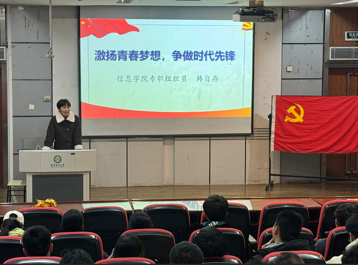 为引导新党员及发展对象进一步坚定理想信念、加强党性修养、提升思想觉悟、强化责任担当。11月19日晚六点,在教五阶二教室召开题为《激扬青春梦想,争做时代先锋》的党课教学,本次党课教学由信息院专职组织员韩自存老师主讲,信息院新党员培训班学员和2025下半年发展对象共同参与学习。