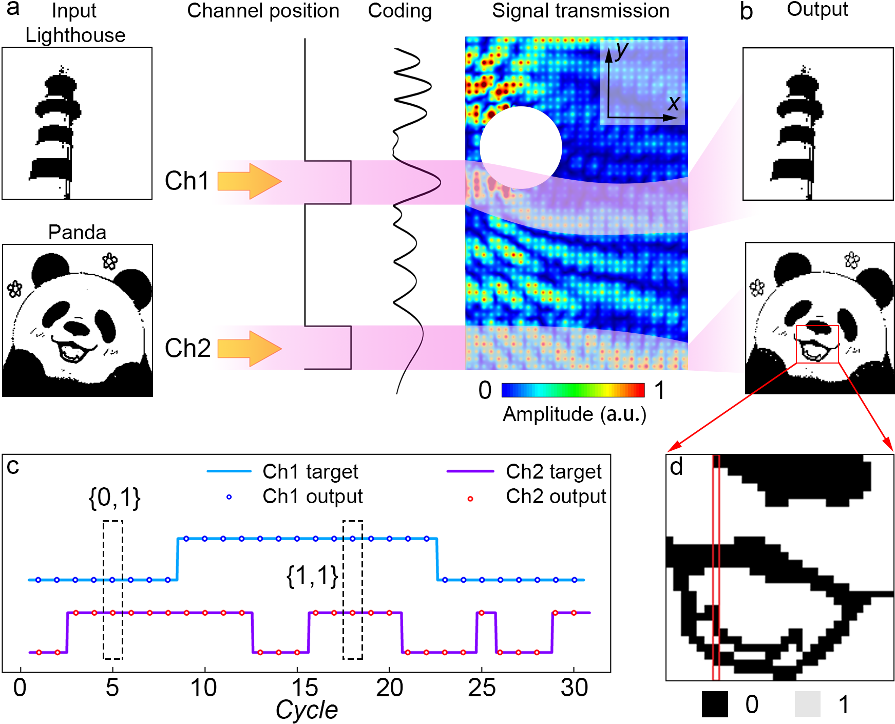此外,该研究提出了一种二维波动体系内非周期声信号的空间复用方法,将亚波长的艾里波束作为一组二维体系内声通信的编码/解码自由基,在保持高质量、强鲁棒性的声传输效率的同时能够有效缩减传输器件的尺寸,为实现二维体系内的高密度声通信提供了一种可行方案。