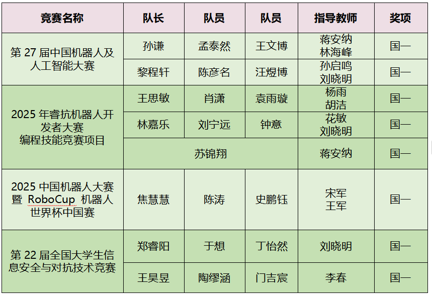 在刚结束的“第27届中国机器人及人工智能大赛”“2025睿抗机器人开发者大赛(RAICOM)”“2025中国机器人大赛暨RoboCup世界杯中国赛”“第22届全国大学生信息安全与对抗技术竞赛(ISCC)”四项一级赛事中,牌九扑克学子捷报频传,累计斩获国家一等奖8项、二等奖11项、三等奖10项,以硬核成绩交出“教育、科技、人才一体化发展”的高水平答卷。
