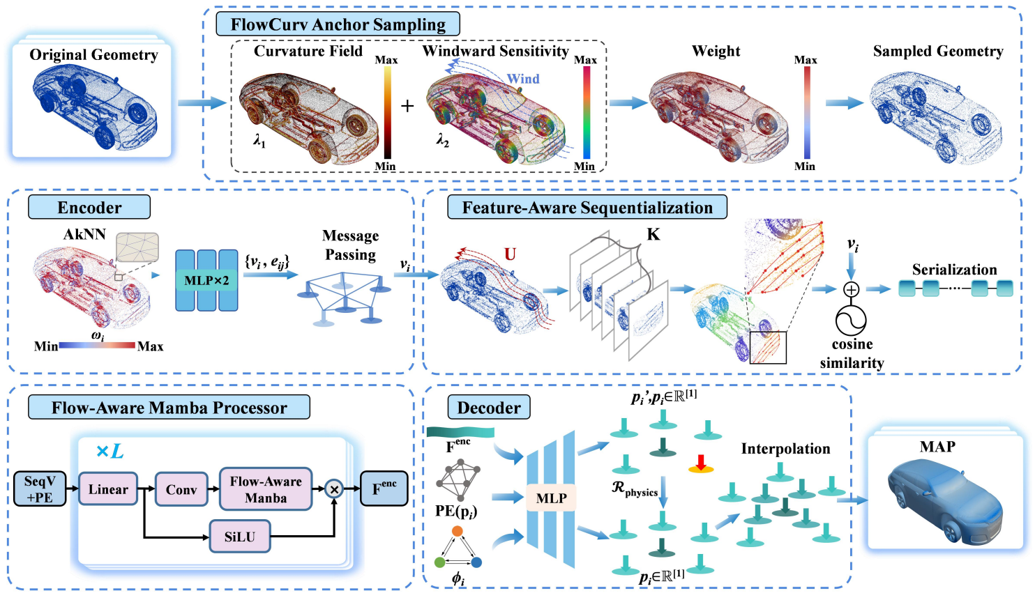 在现代汽车设计中,大规模三维车辆空气动力学预测仍面临严峻的计算挑战。针对传统计算流体力学方法仿真耗时过长,以及现有学习模型在密集网格处理中易陷入高计算复杂度和拓扑信息丢失等问题作者创新性提出了一种名为FCMO的物理感知神经算子。FCMO集成了流体力学原理和选择性状态空间模型,由四个相互协同的核心组件构成。首先,FlowCurv锚点采样策略依据归一化局部曲率与迎风敏感度自适应选择关键网格节点,从而在保持物理一致性的同时减少冗余点;其次,双尺度物理感知位置编码采用特征引导的蛇形扫描机制,将三维不规则网格映射为保持因果关系的序列表示;在此基础上,模型核心流感知Mamba处理器能够依据壁面距离及局部流动特征动态调整状态转移,实现高效的跨尺度信息交互;最后,物理约束解码器通过混合加权插值机制显式强化守恒定律的约束,确保预测结果的物理合理性。Ahmed-BodyDrivAerNet基准上的大量实验证明,FCMO在表面压力预测、壁面剪切应力估算和阻力系数准确性方面均取得了业界顶尖的性能,同时以更少的计算量和内存使用量展现了卓越的计算效率。